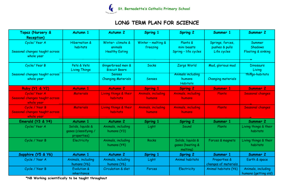 At St Bernadette’s assessment for learning (AFL) is integrated in all parts of the teaching and learning process. In addition to these on-going assessments, the ‘Switched on Science’ scheme has half-termly assessments that we use at the end of a unit. These assessments are then used to inform where pupils are in terms of age related expectations, and identify gaps in learning that need to be addressed in the future.